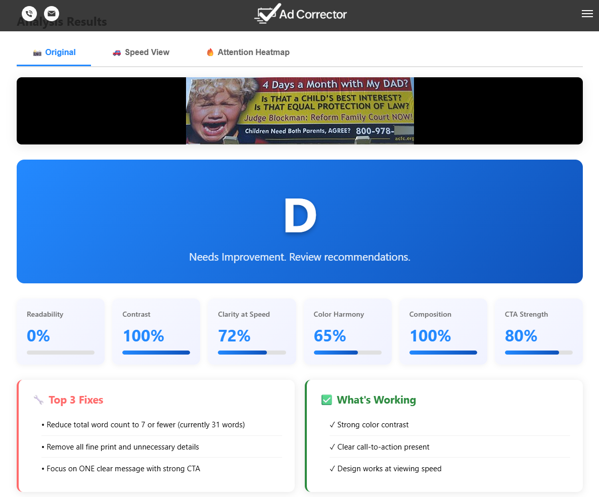 This billboard scored a D for readability. Too much text and visual clutter reduced clarity at speed. Try analyzing your own billboard design with Ad Corrector.